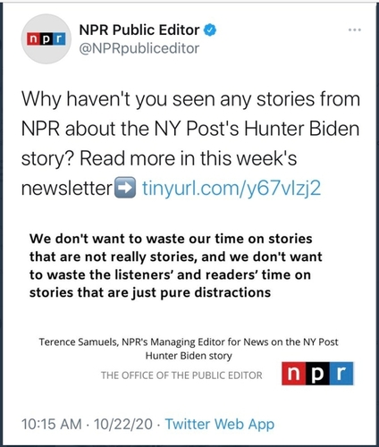 News outlets derided the reports about the Biden family’s corrupt dealings, all of which implicated Joe Biden as the man who pimped out his addled son for huge sums of money, as non-stories. That’s not an exaggeration. It’s explicitly what NPR’s public editor said: