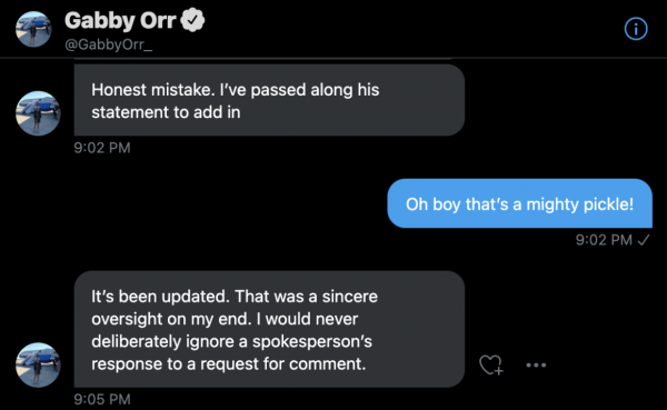 The National Pulse reached out to Orr over the matter, who admitted in direct messages to me, an “Honest mistake,” and “a sincere oversight on my end,” adding: “I would never deliberately ignore a spokesperson’s response to a request for comment.”