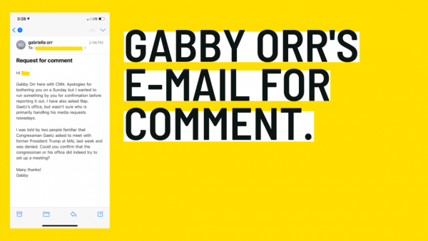 Orr’s e-mail read: “Apologies for bothering you on a Sunday but I wanted to run something by you for confirmation before reporting it out… I was told by two people familiar that Congressman Matt Gaetz asked to meet with former President Trump at [Mar-A-Lago] last week and was denied.”